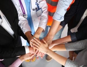 Portrait of people with various occupations putting their hands on top of each other